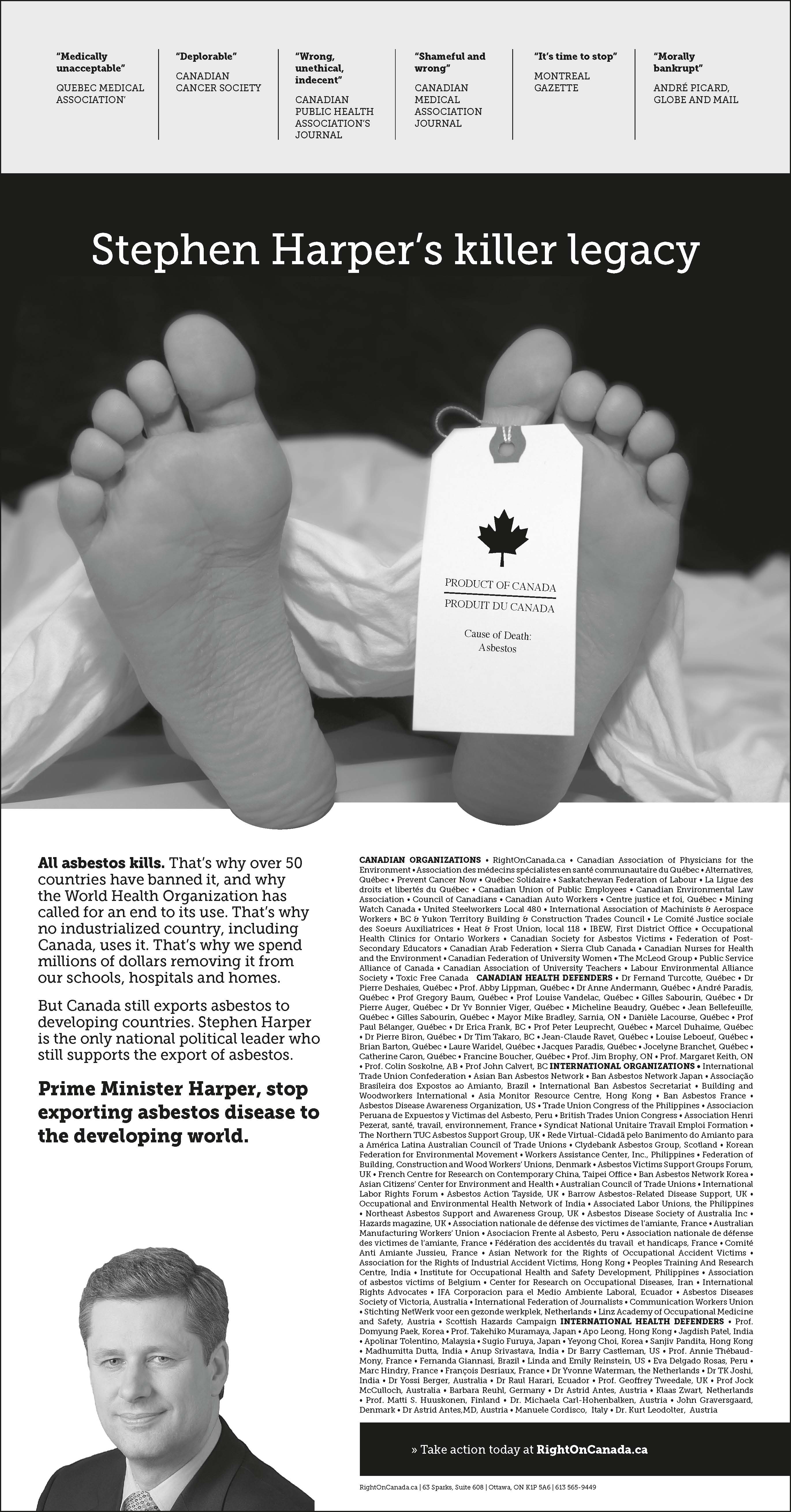 RightonCanada.ca wishes to thank the trade unions, ban asbestos organizations, human rights organizations, asbestos victims, medical doctors, academics, health professionals, health & human rights activists in Québec, across Canada and around the world who endorsed and donated to the ad-petition calling on Canadian Prime Minister Harper to stop supporting the export of asbestos.